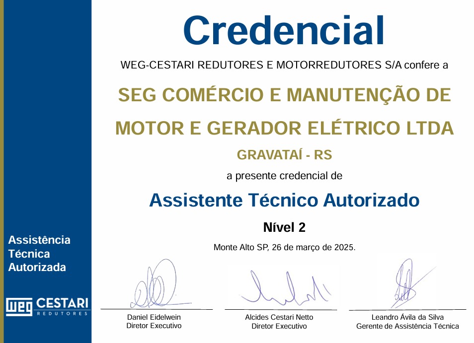 No ano de 2025 foi credenciada como Revenda e Assistência Técnica Autorizada da Divisão de Redutores e Moto redutores da marca WEG CESTARI.