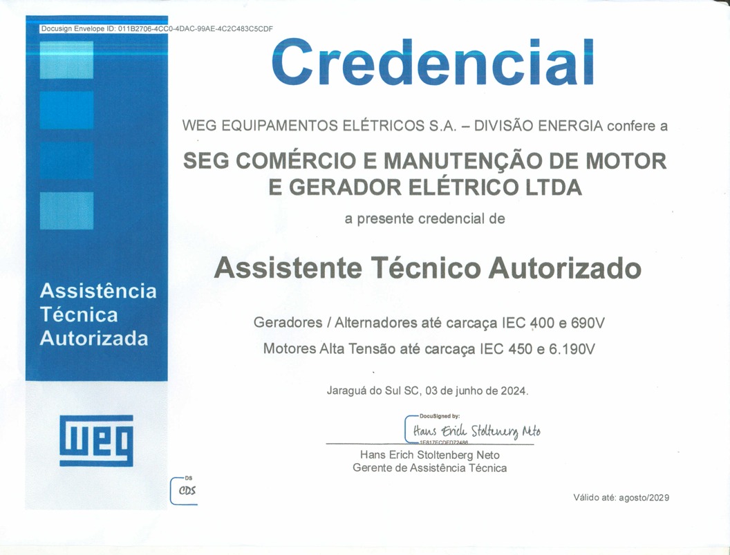 No ano de 2024 foi credenciada como Revenda e Assistência Técnica Autorizada da Divisão de Energia da marca WEG.